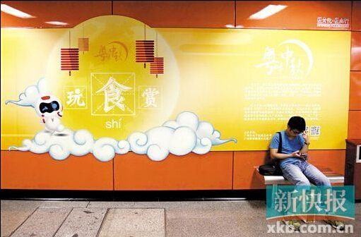 新快报CBD记者在地铁珠江新城站看到,A出入口通道的两面墙壁办起了中秋主题展览,20多米长的展览版以蓝色为背景,一面墙上介绍了拜月光、赏月光的习俗:“月饼是醇厚的金、柚子是鲜活的黄、芋头是沉稳的紫、柿子是热情的红、杨桃是愉悦的绿……享用此美食、美景便是老广生活的完美时刻。”