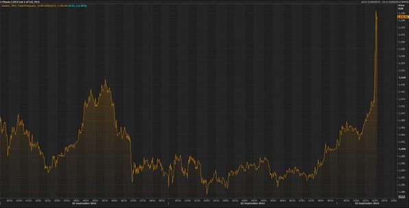 乌克兰方面消息公布后,欧元大涨,黄金下挫,但俄罗斯方面“否认”后, 两者有所回调: