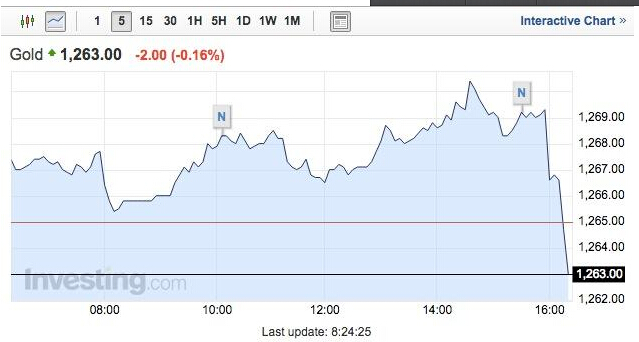 黄金价格瞬间直线下跌7美元,一度跌至1262.10美元/盎司: