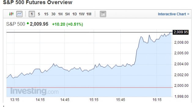 美股也做出了迎接和平的反应,标普500指数期货直线上涨,创历史新高,直奔2010点: