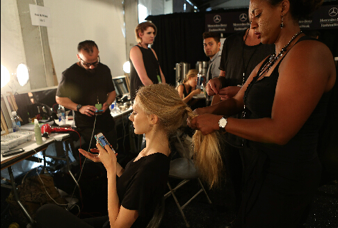 在美国林肯中心,一名化妆师在时装秀后台为模特做头发