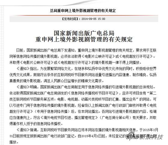《通知》强调,互联网视听节目服务网站应将本网站在播的境外影视剧相关信息,于2015年3月31日前按规定报新闻出版广电行政部门登记。自2015年4月1日起,未经登记的境外影视剧不得上网播放。