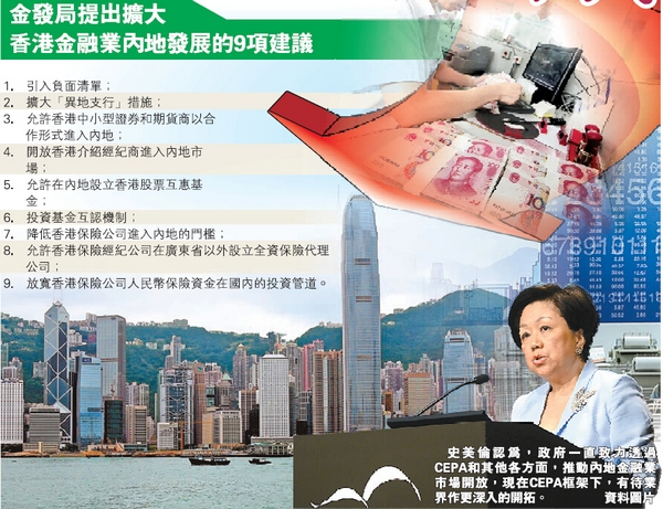 報告稱,金發局充分考慮業界意見后,提出9項具體政策建議,包括引入負面清單概念;設立投資基金互認機制;允許在內地分銷可投資於香港上市股票的開放式互惠基金;把容許設立异地支行和全資保險代理公司的範圍擴大至廣東省以外;容許香港中小型證券及期貨商和介紹經紀商進入內地;放寬香港保險公司在內地有關成立合資企業和進行證券投資的限制。金發局相信,有關政策建議將進一步支持本港銀行、證券、期貨、資產管理和保險業,并深化內地與香港兩地金融服務業的合作。