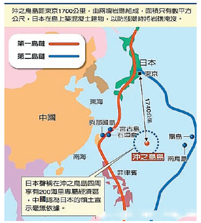 在冲鸟礁问题上,中国一贯认为,冲鸟礁是「礁」,而非日本辩称的「岛」。日本拿冲鸟礁作文章,只是觊觎该片海域丰富的稀有金属资源。还有分析称,日本指「礁」为「岛」的真实意图有三:首先,扩大了日本海域管辖面积。其次,有助於日本争夺这个区域的战略资源。第三,控制战略通道。冲之鸟礁还处於亚太地区第一岛链和第二岛链之间,如果日本把这几块礁石打造成人工岛,建立港口甚至起降飞机,那麽它就可以成为连接第一岛链和第二岛链重要跳板,将会遏制中国於第二岛链之内。