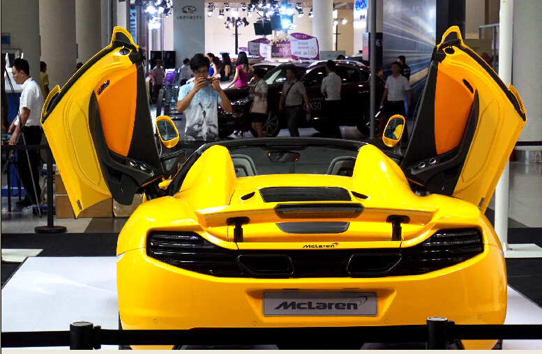 一位参观者在齐鲁秋季车展上拍摄一款展出的跑车