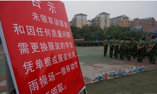 记者10日在三峡职业技术学院的军训操场上看到,一块醒目的红底白字告示牌已立在操场正中,标明“因任何质量问题需更换服装的学生可凭单据或服装到风雨操场一楼移动营业厅领取”。