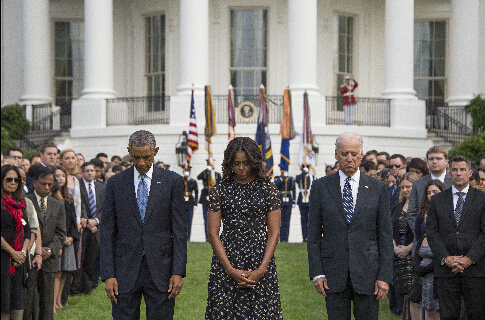 9月11日,在美国华盛顿白宫,(左起)美国总统奥巴马、第一夫人米歇尔·奥巴马、副总统拜登为“9·11”事件遇难者默哀