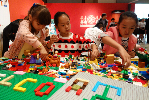 小朋友在“安徒生童话进入中国百年纪念展”现场拼搭玩具