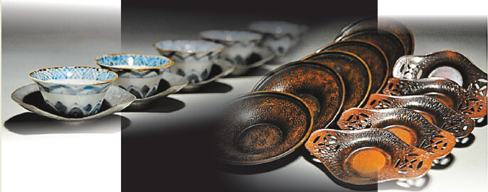 茶盞又稱茶杯,茶托,就是放置茶盞的承盤,用以襯墊茶盞的碟子。與其他茶器一樣,茶盞、茶托的材質、造型、釉汁、裝飾等有個漸漸演變的過程。喝茶的茶盞,先是單杯,后來出現與之配套的茶托。考證認為茶托始於南朝,唐代時的茶托托口較矮,口沿卷曲成荷葉形,以配合花瓣形茶盞;至宋代,盞托成為茶盞的固定搭配,托圈也增高許多;明代流行船形盞托,又稱「茶船」;到了清代,盞托圓形成為茶托主流。梳理這一過程,頗為有趣。