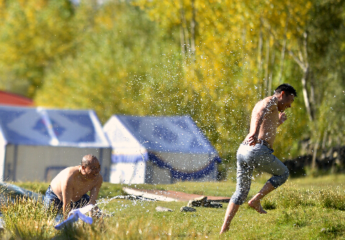 两名男子在拉萨郊区的小溪边上打水仗(9月14日摄)