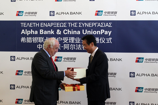 当天上午,银联国际有限公司欧洲分公司总经理魏志宏和希腊阿尔法银行执行总经理莱昂尼达斯·卡索米斯签署了合作协议。根据这份协议,阿尔法银行在希腊的全部逾5万家签约商户以及1300台自动取款机将受理银联卡。