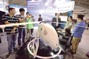 9月16日,为期3天的2014(第五届)中国无人机展览会在北京中国国际展览中心开展。展览以“无人机的军民融合式发展”为主题,展区面积逾4300平方米,共吸引62家相关单位和企业参展,内容涉及防务、农林、测绘、公安、国土勘测等多个领域。图为9月17日参观者在了解瑞士一家公司研制的R350无人机。(包兴安)
