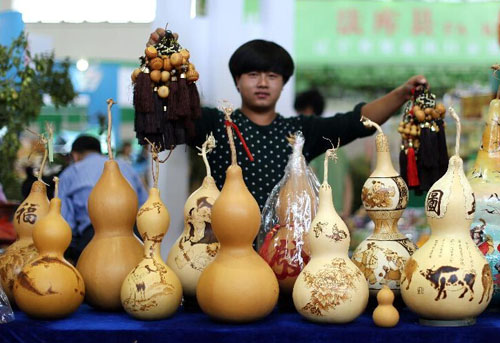 9月18日,一位参展商在展示自己经营的特色葫芦产品。当日,2014中国(沈阳)国际农业博览会在沈阳国际会展中心开幕。本届博览会吸引了海内外22个国家和地区的368家展商。 新华社记者姚剑锋 摄