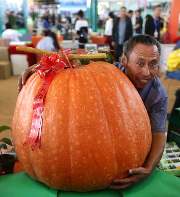 9月18日,一位农民抱着他种植的一个重达144公斤的南瓜王。当日,2014中国(沈阳)国际农业博览会在沈阳国际会展中心开幕。本届博览会吸引了海内外22个国家和地区的368家展商。 新华社记者姚剑锋 摄