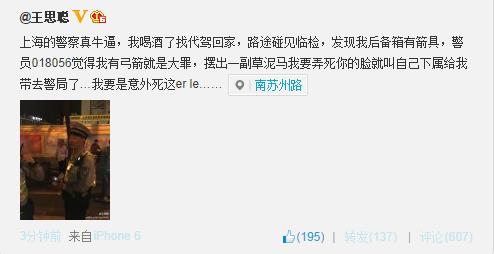 微博发布不久,王思聪就将微博删除。不过还是有众多网友截图。据王思聪微博称,前一天晚上酒后找代驾回家碰见临时检查,因后备箱有弓箭被带去警察局。