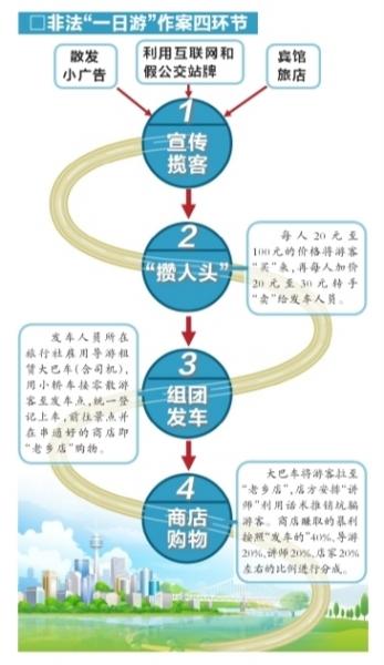 北京非法“一日游”坑骗游客的现象屡见不鲜,因其投资小、收益高,非法“一日游”逐步演变为一条“灰色”产业链。今年以来,北京警方通过对全市警情和网络舆情梳理,发现网络上对非法“一日游”反映强烈。专案组侦查员通过实地走访、查证鉴定,发现此类犯罪嫌疑人作案方式主要由宣传揽客、攒人头、组团发车、商店购物四个环节组成,其中在“老乡店”哄骗游客购买低劣的玉器这一环节是非法“一日游”牟取非法利益的关键。随后,侦查员重点对朝阳区民族园的“新傣家村”和奥体中心的“新傣家村”精品店以及海淀区杏石口桥的“德盛坊”玉器店开展侦查取证。2014年9月19日下午,警方将非法“一日游”相关团伙、幕后老板、股东、店长、经理、主管、财务、“讲师”和发车人等126名嫌疑人全部抓获,当场收缴赃款19万。