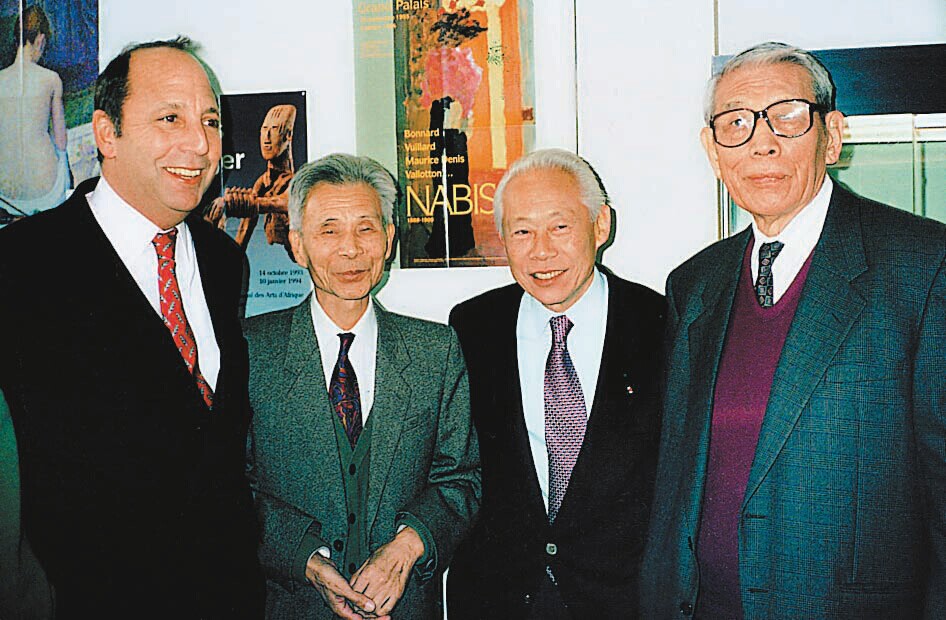 1993年11月吴冠中在巴黎赛努奇博物馆举行个展,朱德群(右一)、赵无极(右二)出席开幕礼