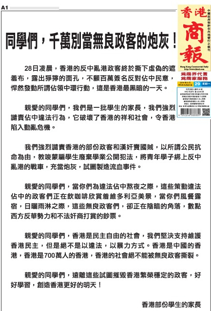 亲爱的同学们,我们是一批学生的家长,我们强烈谴责占中违法行为,它破坏了香港的祥和社会,令香港陷入动乱危机。