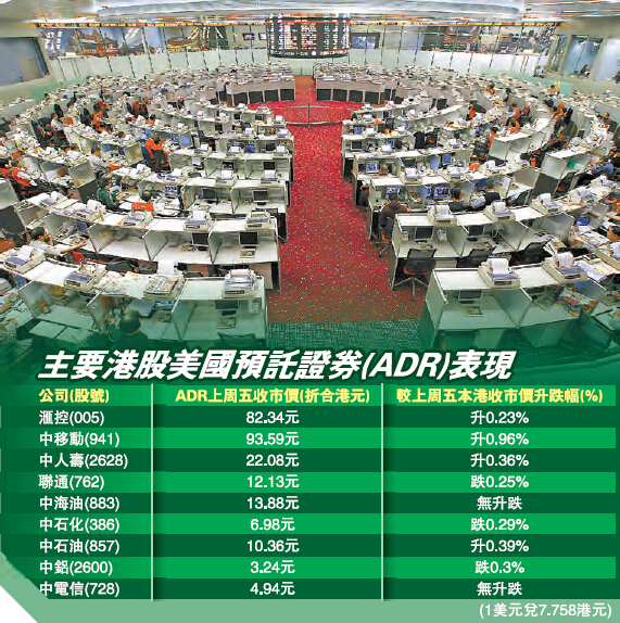 雖然美股上周五全線反彈,但在美國上市的主要港股預託證券(ADR)個別發展。其中,滙控(005)折合港元計收報82.34元,較本港上日收市價升0.19元;中移動(941)收報93.59元,升0.89元。