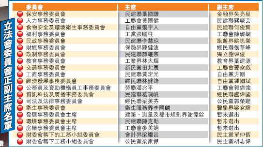 立法會昨日有20個委員會開會,并選出新一年度正、副主席人選。截至昨日,建制派贏得16個事務委員會主席席位,以及13個副主席席位;反對派則贏得在2個事務委員會主席、2個副主席,以及2個財委會轄下小組委員會得到正、副主席;有3個事務委員會未能選出副主席。立法會內務委員會、財務委員會料今日選出正、副主席。泛民出蠱惑奪2正副主席