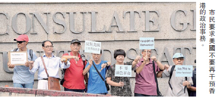 【香港商報訊】記者何加祺報道:10多名市民昨午到美國駐港總領事館抗議,指美國一直以來透過代理人嘗試影響香港的民主發展,要求美國政府不要再干預香港的政治事務,停止一切資助「占中」活動。有到場的市民表示,「占中」已令到不少香港人有怨氣,因已嚴重影響到商戶及市民的生活,希望「占中」者盡快撤走。促勿再干預港政治事務