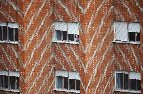 10月9日,在西班牙马德里卡洛斯三世医院,感染埃博拉病毒的西班牙女护士的丈夫哈维尔·利蒙从隔离病房窗户往外观看。他目前尚未出现任何症状。