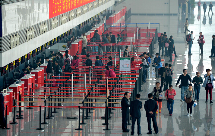 10月10日,旅客在石家庄国际机场2号航站楼内办理登机手续