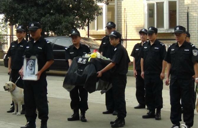 10月9日下午,武汉刑侦局警犬大队为8日不幸去世的警犬旺财举行了简朴而庄重的葬礼,全体民警向这位“无声的战友”敬礼,作最后的道别。“旺财”出生于2003年1月22日,是一只优秀的警犬,曾被评为“公安部南昌片区功勋犬”,为带犬民警争得个人三等功3次。