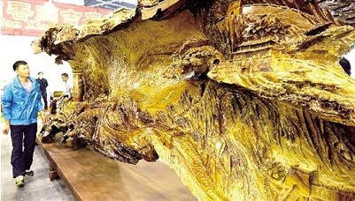 记者注意到,一件巨大的樟木木雕吸引了众多的观众。和它巨大的身躯相匹配的,还有它不菲的“身价”。据木雕的主人介绍,这件木雕作品来自福建,是由一棵巨大的香樟树树干雕琢而成。树干有一部分空了,工人们根据树干自身的形状,创造出了这个名为“万里江山”的艺术作品,大气磅礴,巧夺天工,中间空的部分雕刻上了毛泽东的诗词《沁园春·雪》,每一个细节都非常精致。“这件木雕长5米多,高3米多,是由几名工人花了大概8个月的时间雕成的,售价为88万元。”