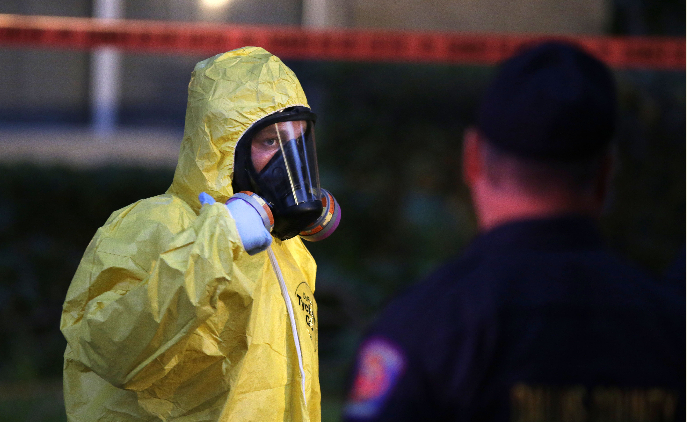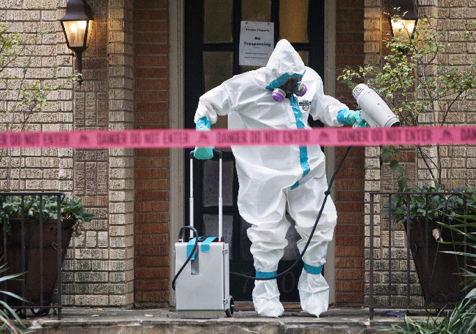 10月12日,在美国达拉斯,一名身穿防护服的危险品紧急处理小组工作人员为第二例埃博拉感染病例的住所消毒。