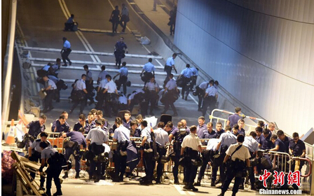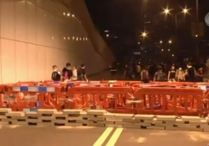 14日晚间,约400多名“占领中环”非法集会者聚集在金钟龙和道,随后冲入龙和道隧道,搬运胶质图板和警察备用的铁马,并就地挖取附近的水泥渠盖,搭设起新的路障。