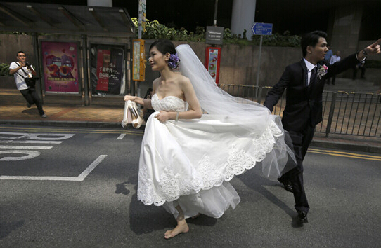原标题:香港新娘赤足狂奔穿越“占中”封锁区赶注册(图)
