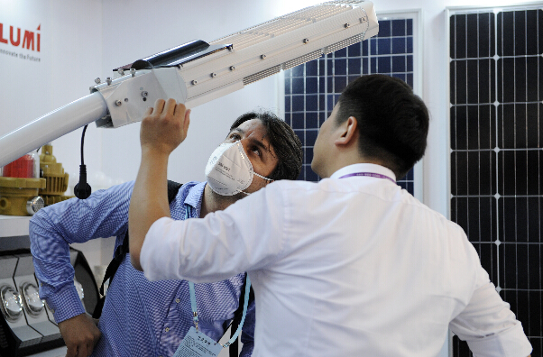 一位外国采购商在广交会新能源展区咨询一款太阳能灯
