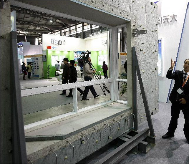 10月14日,工作人员(左)在展会上向观众介绍新型的墙体结构