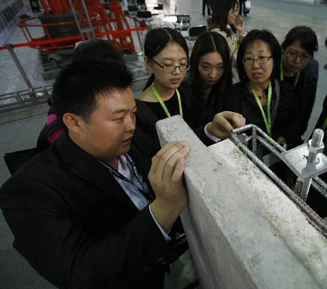 工作人员(左)在展会上向观众介绍建筑钢筋混凝土预制件(新华社记者 方喆摄)