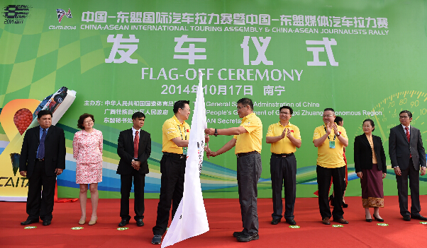 嘉宾在中国-东盟国际汽车拉力赛发车仪式上授旗