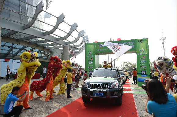 参加中国-东盟国际汽车拉力赛的车手挥旗出发