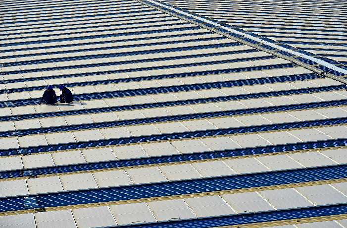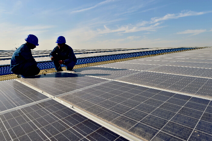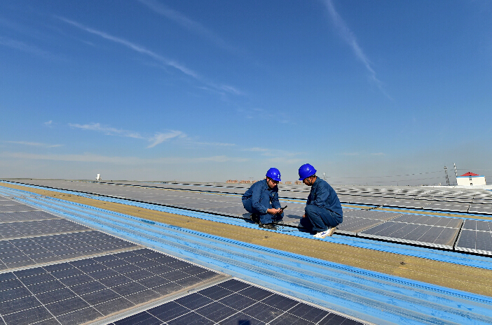 10月16日,在山东省淄博市高新区德诺铝业有限公司的厂房屋顶光伏发电站,淄博供电公司工作人员在送电前为光伏发电线路做检查