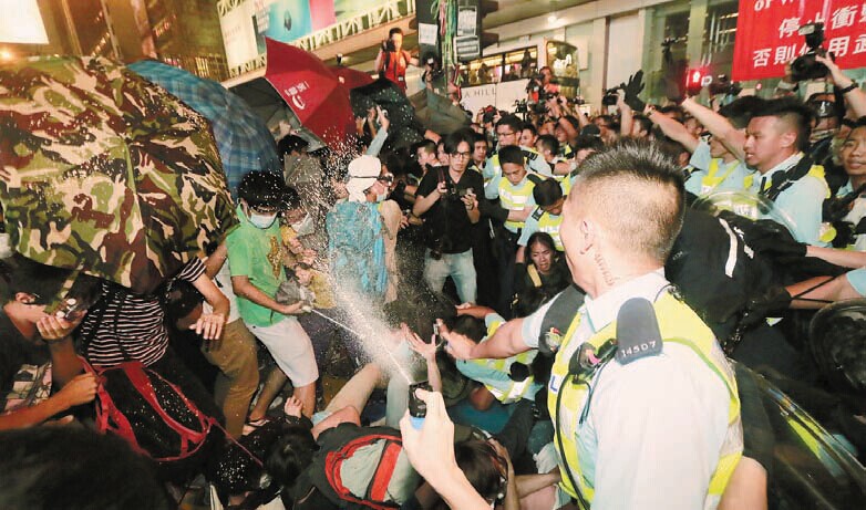 由於聚集者愈來愈多,把彌敦道及亞皆老街四周「迫爆」,晚上約7時半,旺角彌敦道惠豐中心對開,有警員搶奪示威者的帳篷,觸發雙方對峙,警方其後出示黃色及紅色警告旗,警告示威者不要衝擊,未幾有人嘗試突破警方防線,包括拿開分隔的鐵馬,最終警員一度須施放胡椒噴霧控制場面,有市民「中椒」,亦有人戴上眼罩及用雨傘抵擋,部分示威者被警員按在地上制服,被帶走時面部流血及嘔吐。
