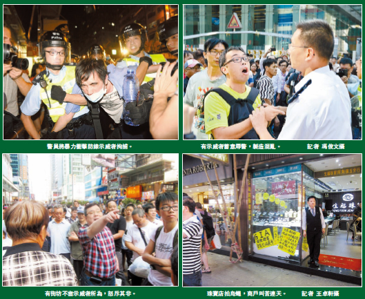 【香港商報訊】記者馮仁樂、王卓軒報道:佔領行動踏入第22天,警方前日清晨在旺角移除障礙物後,一度恢復旺角部分交通,但大批示威者從前晚至昨日凌晨重新佔領彌敦道等主要道路,警方施放胡椒噴霧及出動警棍都未能驅散示威者,令旺角一帶交通再次陷入癱瘓。警方事後稱,估計有9000人非法霸佔彌敦道南行線,行動中警方拘捕33人,共有18名警員勇戰受傷。