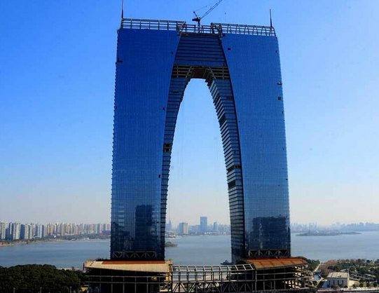 2014年1月21日,屹立于苏州金鸡湖畔的地标建筑东方之门,“新裤子”刚刚穿好。
