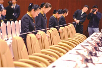 会议服务人员拉线摆放桌椅。范继文摄(京华时报发)