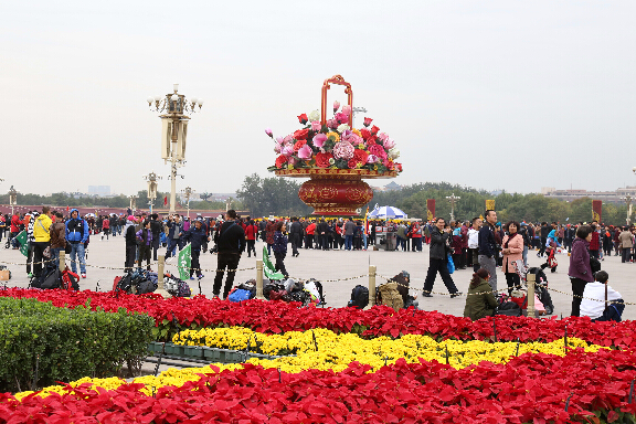 为了迎接APEC会议在北京召开,北京天安门广场更换了东西两侧的花球、花柱、花带以及中心花坛所使用的花卉,国庆期间使用的花卉被一些耐寒的花卉替代。