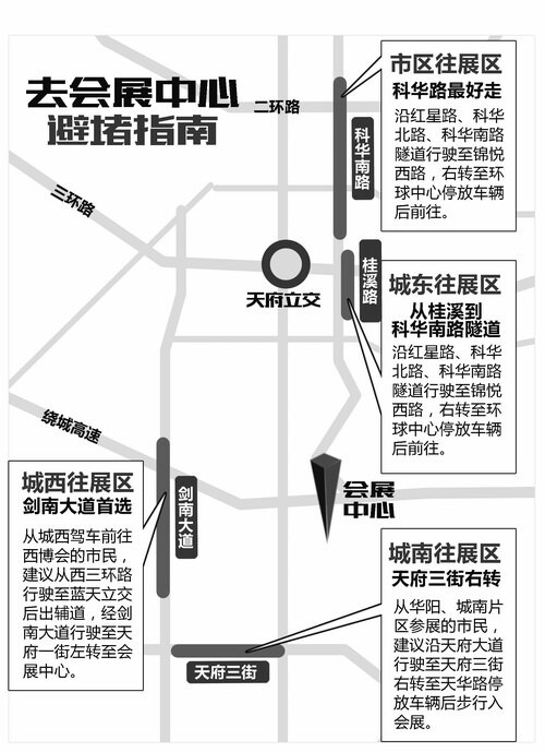 从华阳、城南片区参展的市民,建议沿天府大道行驶至天府三街右转至天华路停放车辆后步行入会展。 华西都市报记者李鑫
