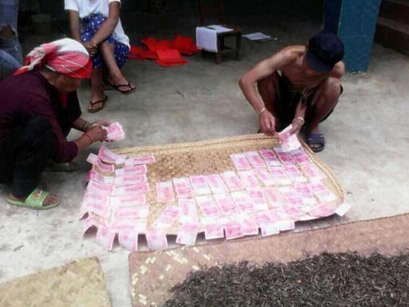 娜戈家6口人,有20多亩老树茶(树龄30年以上)。今年4月,茶叶价格攀升到了有史以来最高点,娜戈家采摘的茶叶一下子卖了20多万元。老人从未见到这么多钱,高兴得眉开眼笑。收茶老板见状,便让她将20多万元茶叶钱抱在了怀里,然后用手机拍下传到了网上。此照一出,引来网友热议。