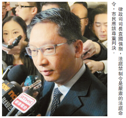 【香港商報訊】記者馮仁樂報道:多個團體於本月20日成功向法庭申請臨時禁制令,禁止各區示威者再霸佔道路。但佔領者明知有藐視法庭的風險,依然拒絕離開。律政司司長袁國強昨日會見傳媒時表示,法庭禁制令是嚴肅的法庭命令,港人應該尊重判決,不希望社會看到佔領者違反法庭命令,令其他人「有樣學樣」,對香港法治帶來負面影響。