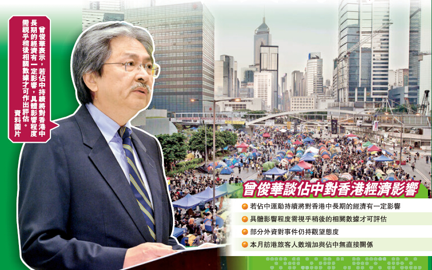曾俊華昨日從北京返抵香港,他在機場會見傳媒時表示,佔中對本港經濟的影響到底有多大,需要待收集準確數據後才能進行評估,但若行動持續進行,相信將在一定程度上影響香港中長期經濟發展。目前得悉有部分外資因此持觀望態度,政府會繼續留意相關情況。