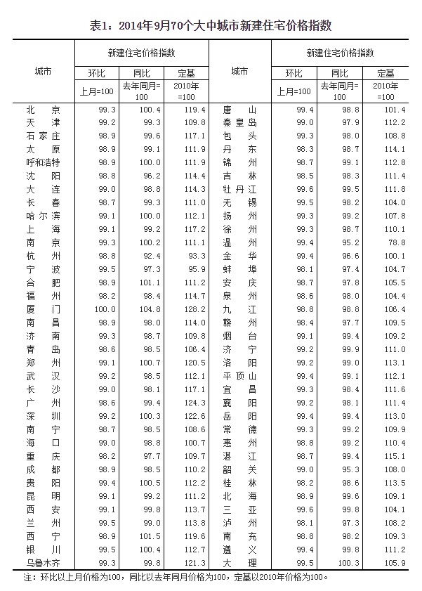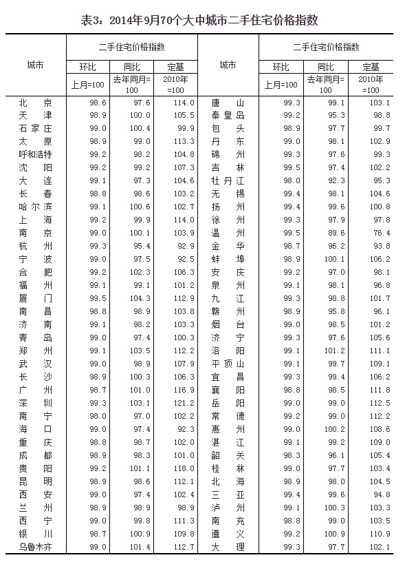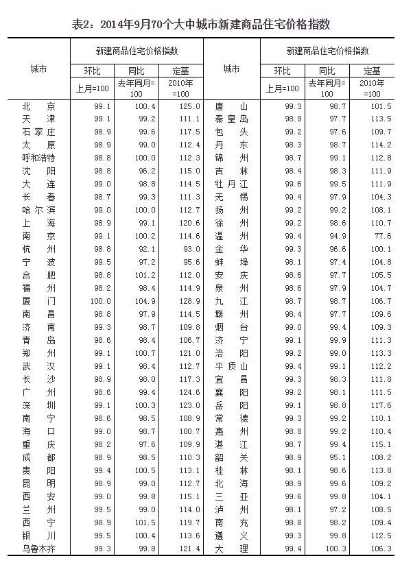 (二)与去年同月相比,70个大中城市中,价格下降的城市有58个,持平的城市有2个,上涨的城市有10个。9月份,同比价格变动中,最高涨幅为4.9%,最低为下降7.9%。