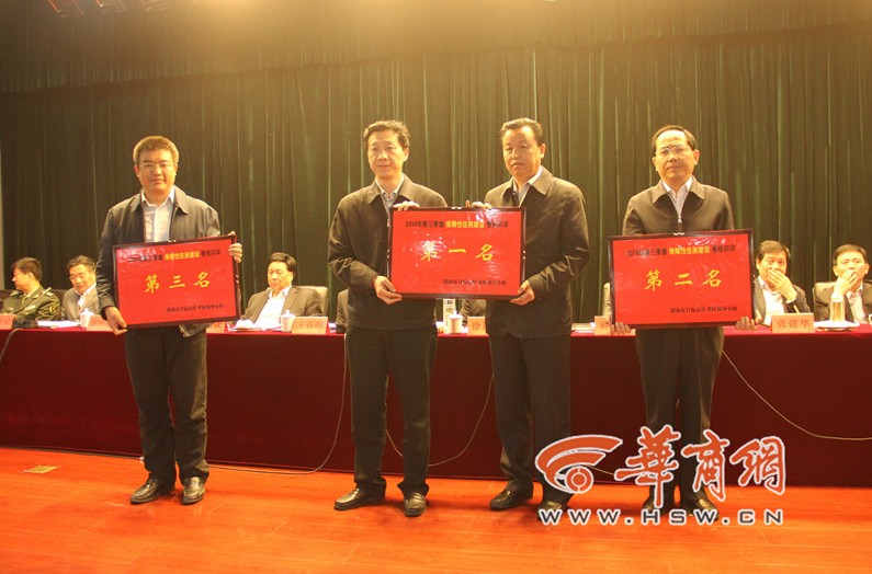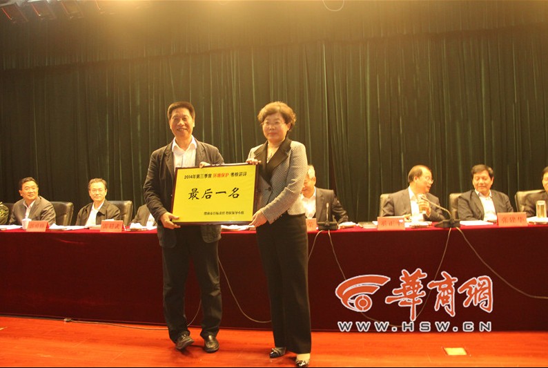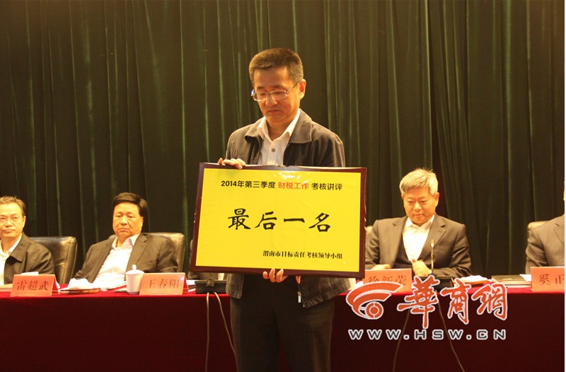 站在领奖台上,一般都是获得了好成绩,而昨日下午,在渭南市召开的2014年综合观摩暨第三季度工作讲评会上,通过渭南市考核办对全市13个县市区的第三季度固定资产投资与重点建设、财税工作、住房保障工作、安全生产、小城镇建设及环境保护六方面的工作考核,评选出各自项目中的前三名和最后一名,分别为其颁发红牌和黄牌。有6个县市区因为“较差”也上台领奖,他们领到的是一个“黄牌(较差)”。