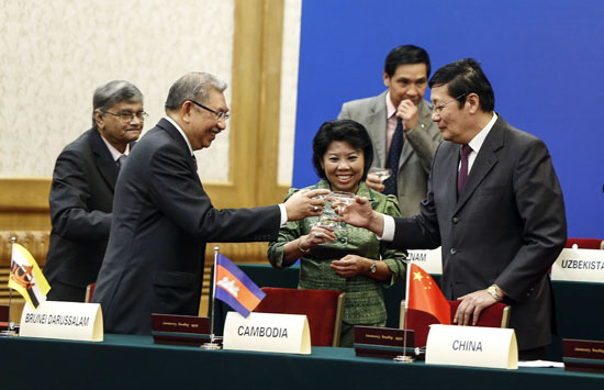 24日,21个亚投行意向创始成员国代表共聚北京,在备忘录上一一签字。